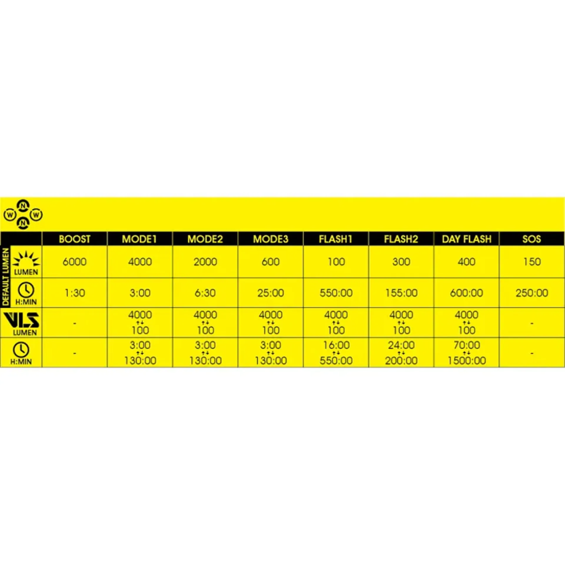 • modes: boost / mode 1 / mode 2 / mode 3 / flash 1 / flash 2 / day flash / sos