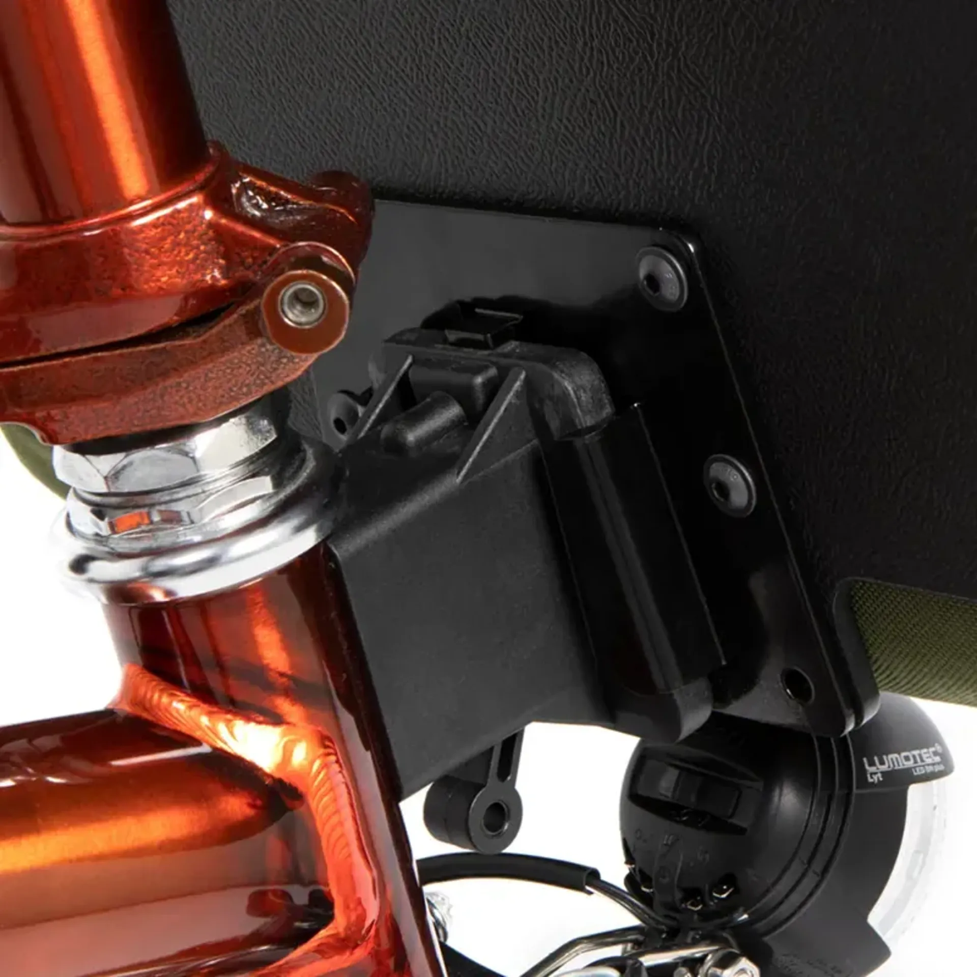 The bag is mounted via a Brompton front carrier block compatible fitting, both external and internal stiffeners enable the bag to hold its shape even when fully loaded. Made of 100% waterproof textured nylon with a tape sealed lining, spare clothes and tech are guaranteed to stay dry on the wettest of rides. The bag is also compatible with a Brompton front light, dyno light and front reflector.