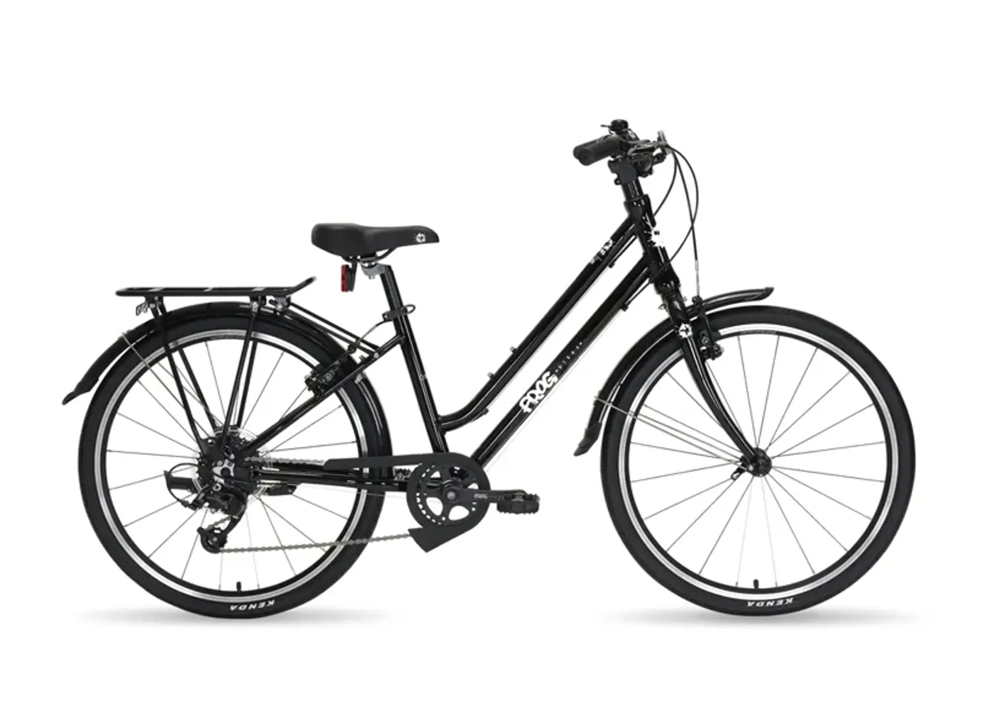 Designed for daily use, Frog's City bike allows children to commute to school or simply cruise the city in comfort and style. This versatile bike provides an upright ergonomic seating position, easy-to-mount step-through frame, 8-speed derailleur gears, a floating chain glider, full-length mudguards, a kickstand, and a pannier rack, so riders are fully equipped for the city.