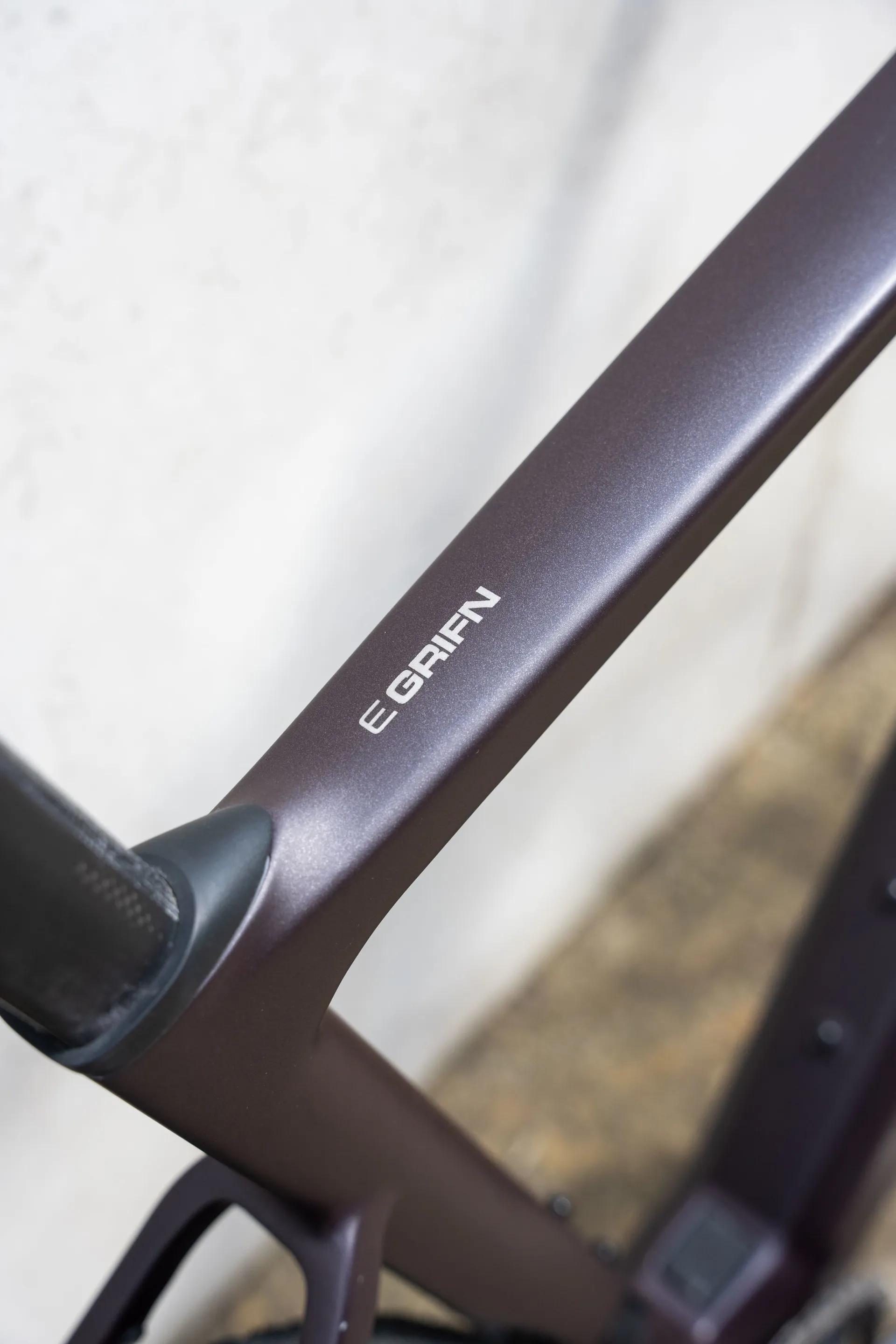 The geometry of the E-Grifn is the same as that of the Grifn RS, with a removable front derailleur clamp, space for tires up to 42 millimeters, and the UDH hanger. The battery is neatly integrated into the frame, maintaining the sporty look of the E-Grifn.