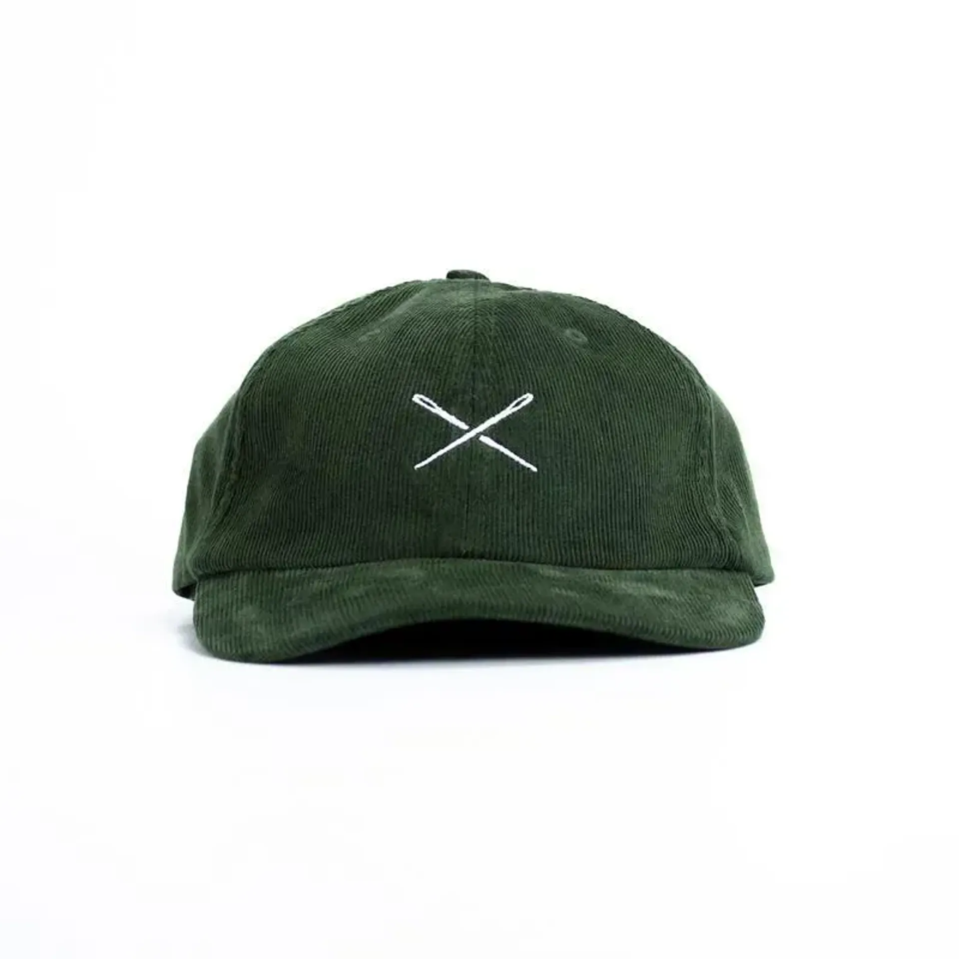 Cotton corduroy six panel cap with a soft unstructured crown, cotton twill sweatband, interior taping and adjustable fabric strap with metal buckle and grommet. Restrap needles embroidery and woven label detailing.