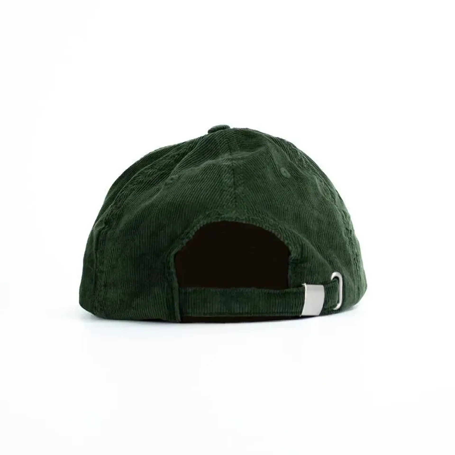 Cotton corduroy six panel cap with a soft unstructured crown, cotton twill sweatband, interior taping and adjustable fabric strap with metal buckle and grommet.