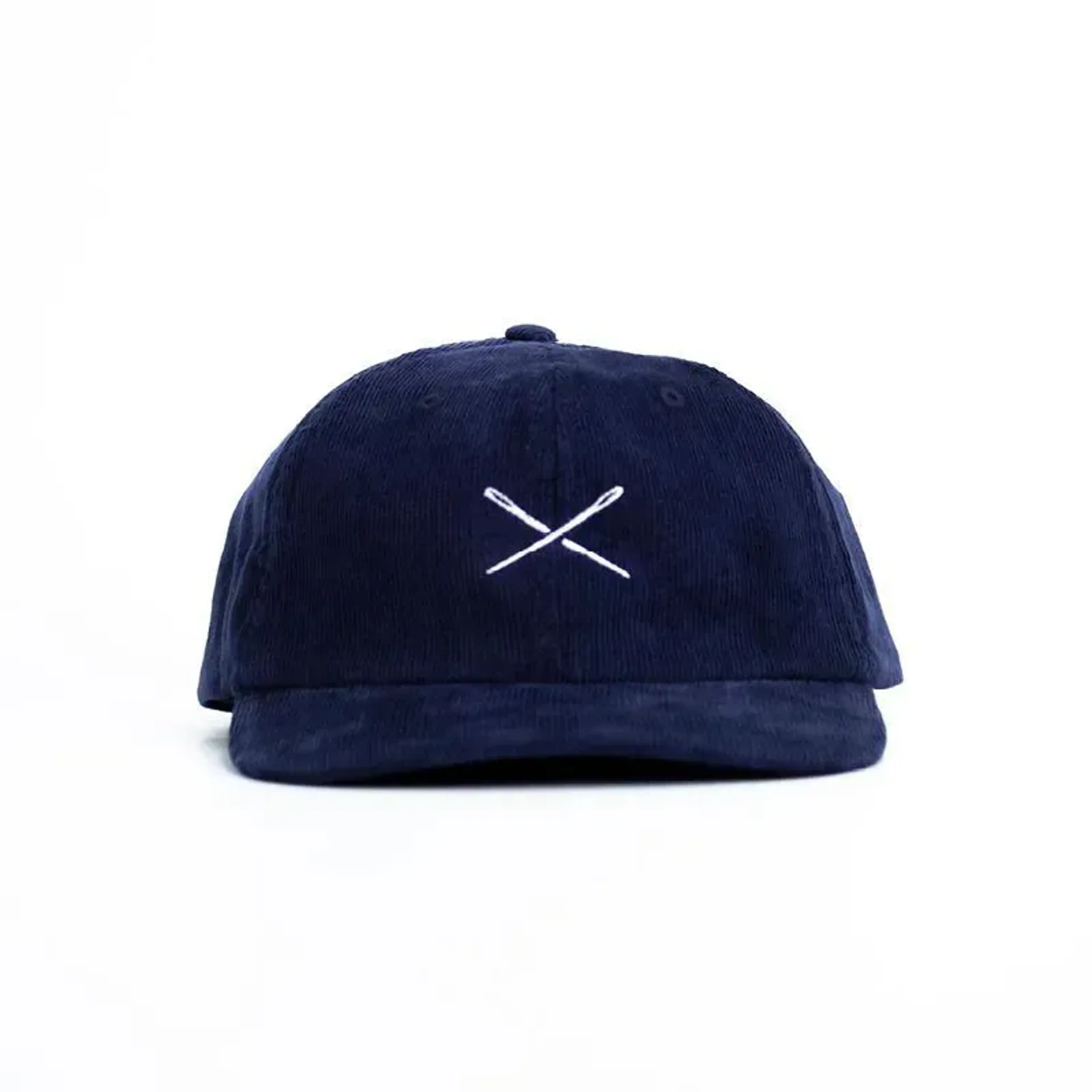 Cotton corduroy six panel cap with a soft unstructured crown, cotton twill sweatband, interior taping and adjustable fabric strap with metal buckle and grommet. Restrap needles embroidery and woven label detailing.